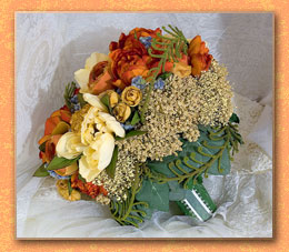 You won't be disappointed carrying one of my bridal bouquets down the aisle. All bouquets are original works of art, with styles ranging from whimsical to vintage to traditional. There are many different embellishments used including Swarovski crystals, beaded trims, silk ribbons, delicate pearls, just to name a few. Occasionally, I'll place a surprise for the bride in the bouquet, such as tiny pink love birds nestled in the pedals (see "Bridal Pink #1"). I also place additional design emphasis and detail on my signature handles.
